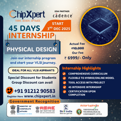 ChipXpert 6-WEEK , VLSI Design Verification Internship provides comprehensive training in functional verification methodologies, covering Verilog, UVM, simulation, and debugging techniques. This program includes fundamental concepts, hands-on projects, and exposure to industry-standard EDA tools, ensuring practical experience in ASIC/FPGA verification.